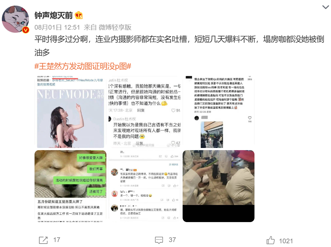 如此种种,将扒皮的方向导向了王楚然本人的品行,于是经常翻白眼、大学没毕业、小牌大耍欺压素人、作为资源咖抢人角色、天天艳压碰瓷……这些真的假的、新的老的黑点一同被翻了出来,最终酿成了眼下的局面。