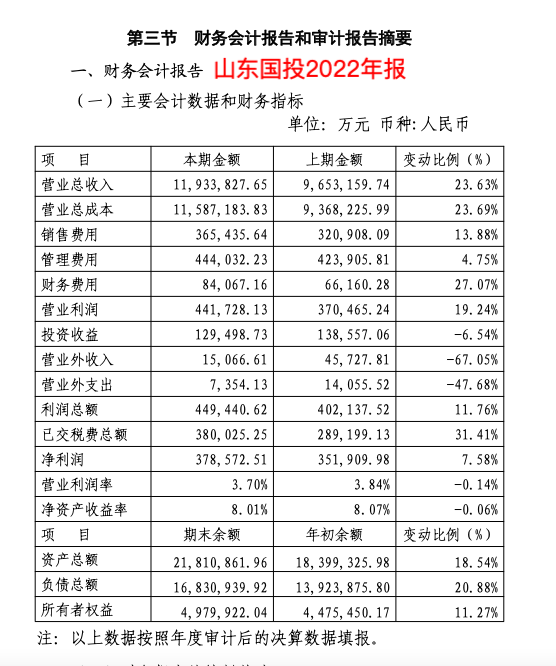 财报显示,2022年,山东国投实现净利润37.86亿元,较上年同期的35.19亿元,同比增长7.58%;2022 年,公司完成投资总额 25.43 亿元,其中,固定资产项目投资额 3.69 亿元,长期股权项目投资额 21.74 亿元。