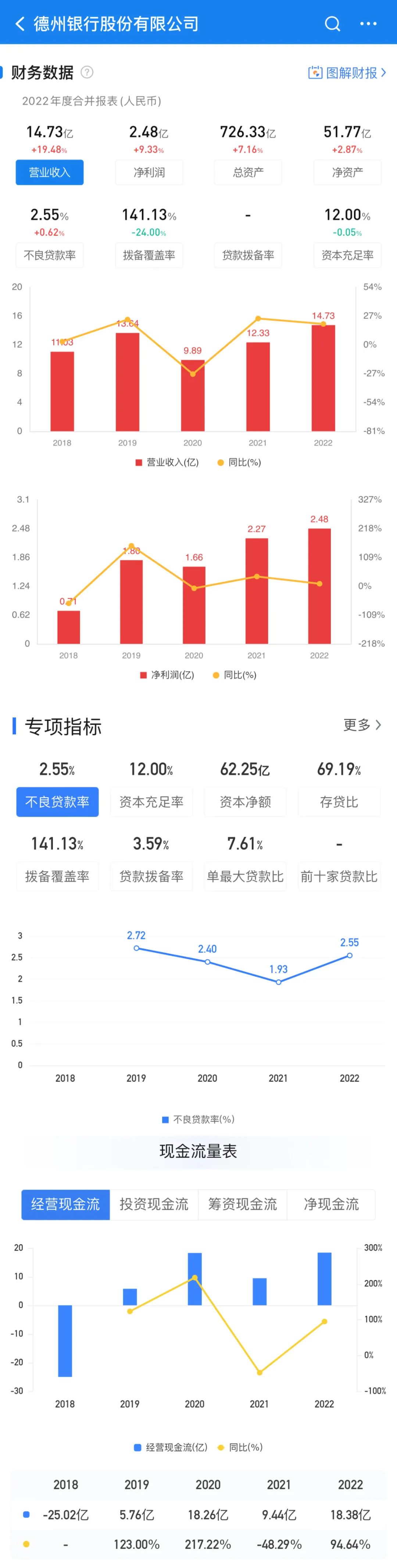 可喜的是,该行营收规模、盈利能力得到提升:2021年、2022年德州银行分别实现营业收入12.33亿元、14.73亿元,同期净利润分别为2.27亿元、2.48亿元。截至2022年末,德州银行总资产726.33亿元。