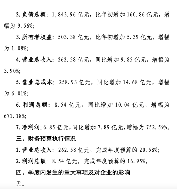 今年一季度,山东国投实现营业总收262.58 亿元,同比增幅3.90%,完成年度预算的 20.58%;实现利润总额8.54 亿元,完成年度预算的 16.95%;实现净利润6.85 亿元,同比增幅 752.59%。