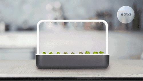它的“篮子”部分实际上是一个水槽,用来放置特制的培养土和水,顶部的“提手”则设置有照明LED。使用Smart Garden在家里种菜,只需要三步:插上电源,装满水槽,在菜苗长高的时候随之升高“提手”。Smart Garden 9会自动调节光照、水氧和养料,做好这三步,每两个月加一次水,就可以坐等无污染的新鲜有机蔬菜自己长高长大啦。