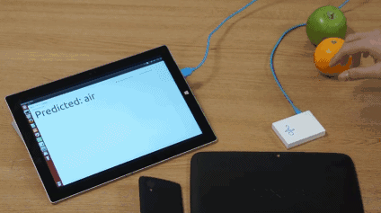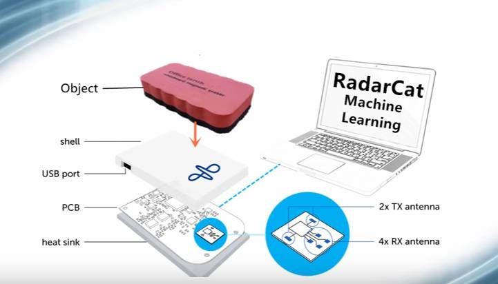 RadarCat内置了 Project Soil 芯片,这些芯片会发射特定的电磁波,当物体进入这些波的范围时,内置传感器可以从物体发射的特定的能量图案中获取物体的数据,例如形状,尺寸,材料等等,再结合深度学习算法识别出特定的物体。