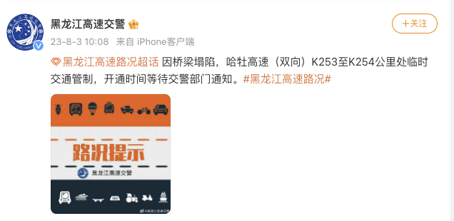 @黑龙江高速交警 发布消息,因桥梁塌陷,哈牡高速(双向)K253至K254公里处临时交通管制,开通时间等待交警部门通知。