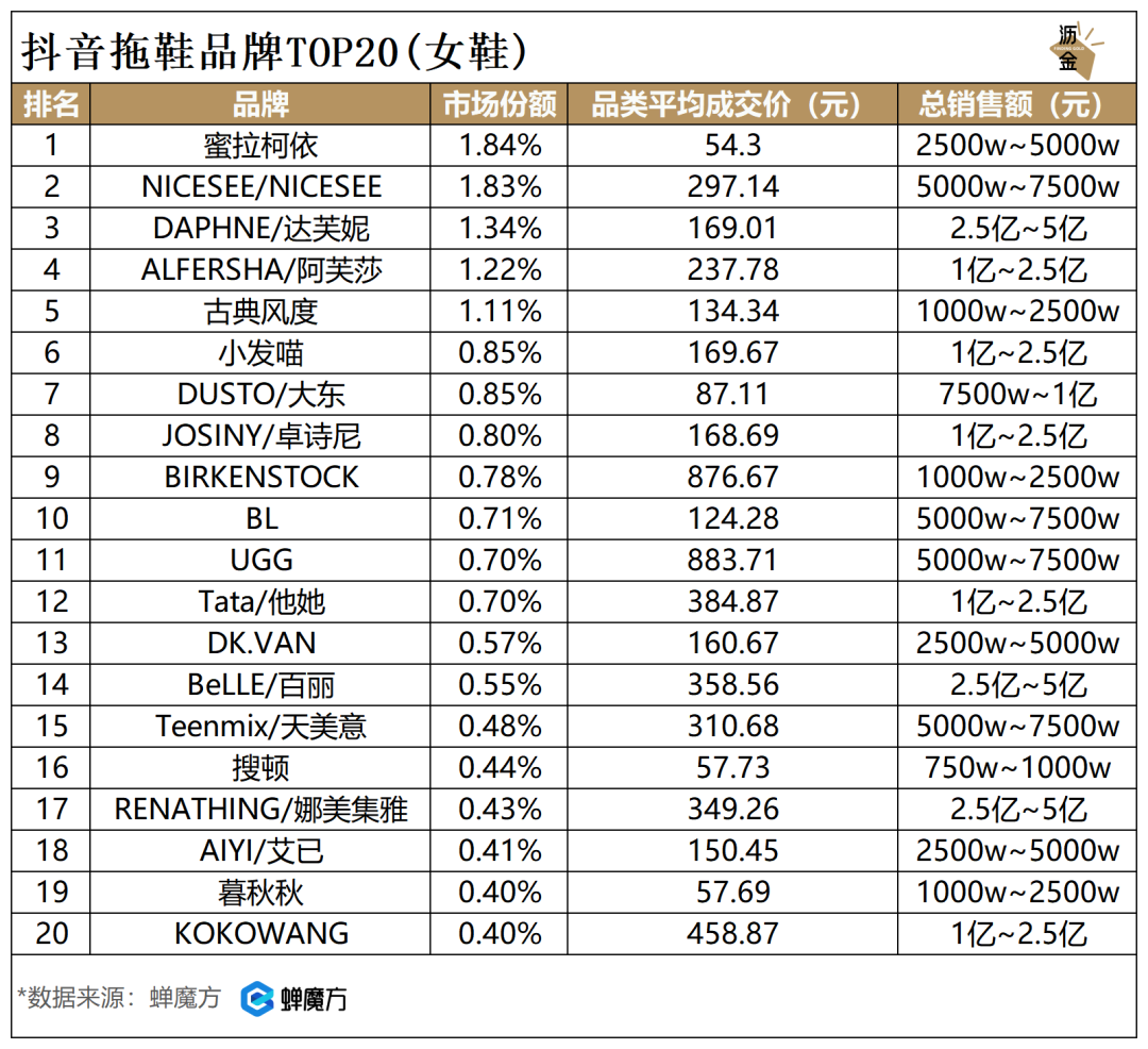 比如蜜拉柯依靠单价为55.9元的爆品法式高跟凉拖,虽然荣登H1销售额第一,但品牌也占有1.84%的市场份额。这意味抖音的女拖市场更多是爆品逻辑,而不是品牌打法。