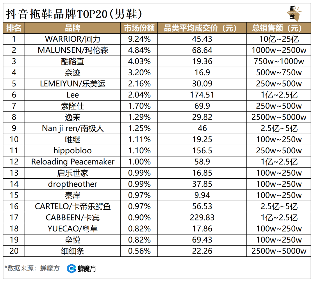 在抖音男拖TOP20品牌榜单中,回力以9.24%的市场份额占据榜首,其热销产品是均价为80元的男士一字拖。
