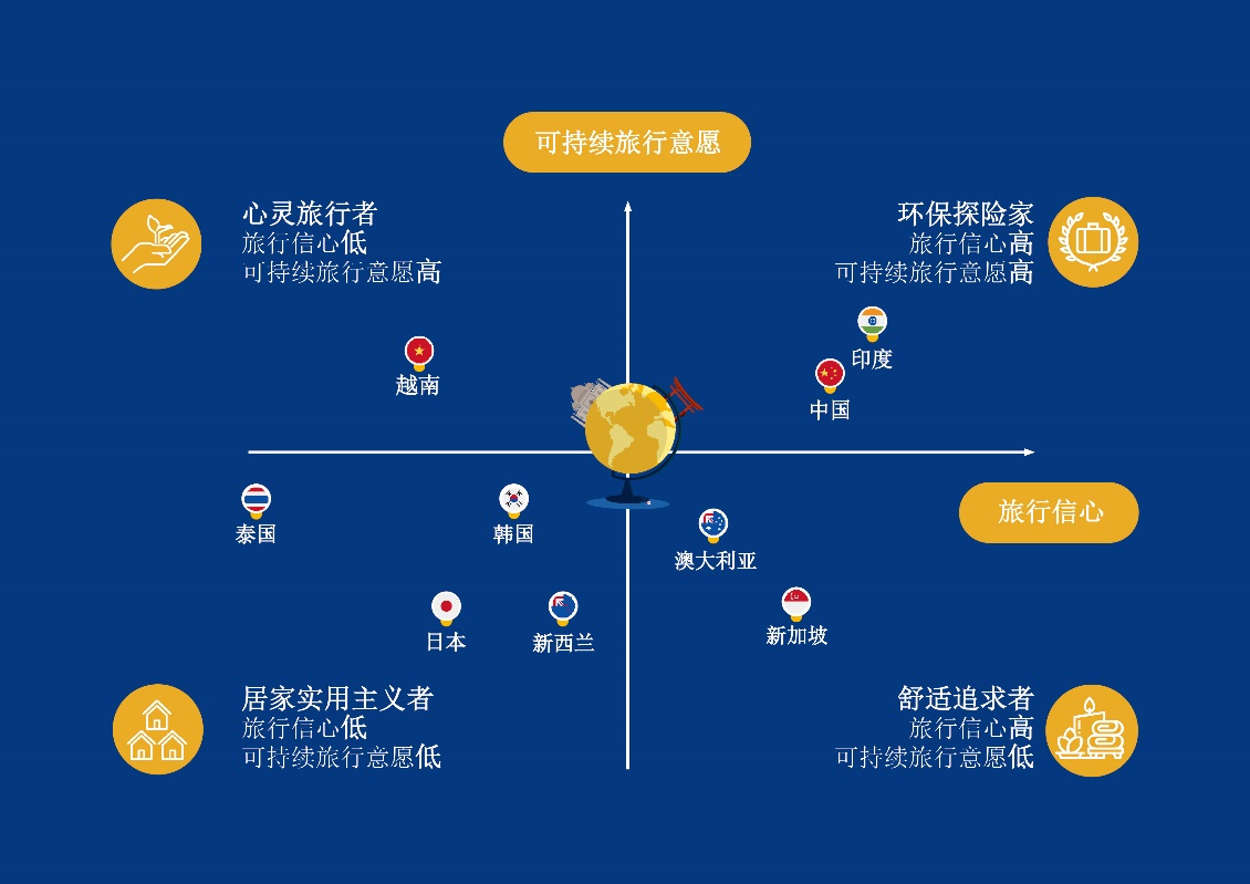 环保探险家(印度、中国):这类旅行者积极追求环保和可持续旅行,他们热衷于探索,同时希望尽量减少对环境的影响。在这样的价值观引导下,他们积极参与生态旅游,选择可持续的住宿方式,还致力于支持和帮助当地社区。舒适追求者(新加坡、澳大利亚):这类旅行者注重旅行的舒适度和便利性,追求奢华的体验和住宿,尽情享受放松舒适。他们更关注个性化服务和高品质设施,在做出旅行决策时,他们优先考虑的是舒适度,而非可持续性。心灵旅行者(越南):这类旅行者更关注环境责任,并且希望帮助当地社区,因此,他们会选择审慎周到的旅行方式。然而,这些旅行者在陌生环境中常常会感到焦虑,他们会积极寻求资源来克服旅行中的担忧,增强信心。居家实用主义者(新西兰、韩国、日本、泰国):这类旅行者倾向于选择实际可行的旅行方式,更愿意选择离家近的目的地。他们注重便利性和效率,并致力于优化利用时间和资源。他们会充分利用有限的时间和资源,追求高效、无缝连接的旅行体验,希望行程安排得井井有条。