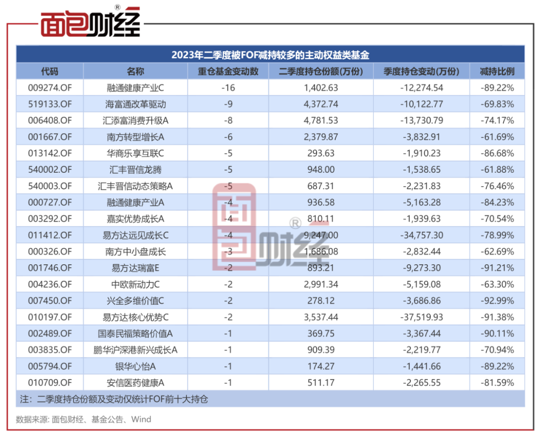 数据显示,十余只主动权益类基金二季度被FOF减持超1000万份,减持比例超6成,且重仓基金数减少。