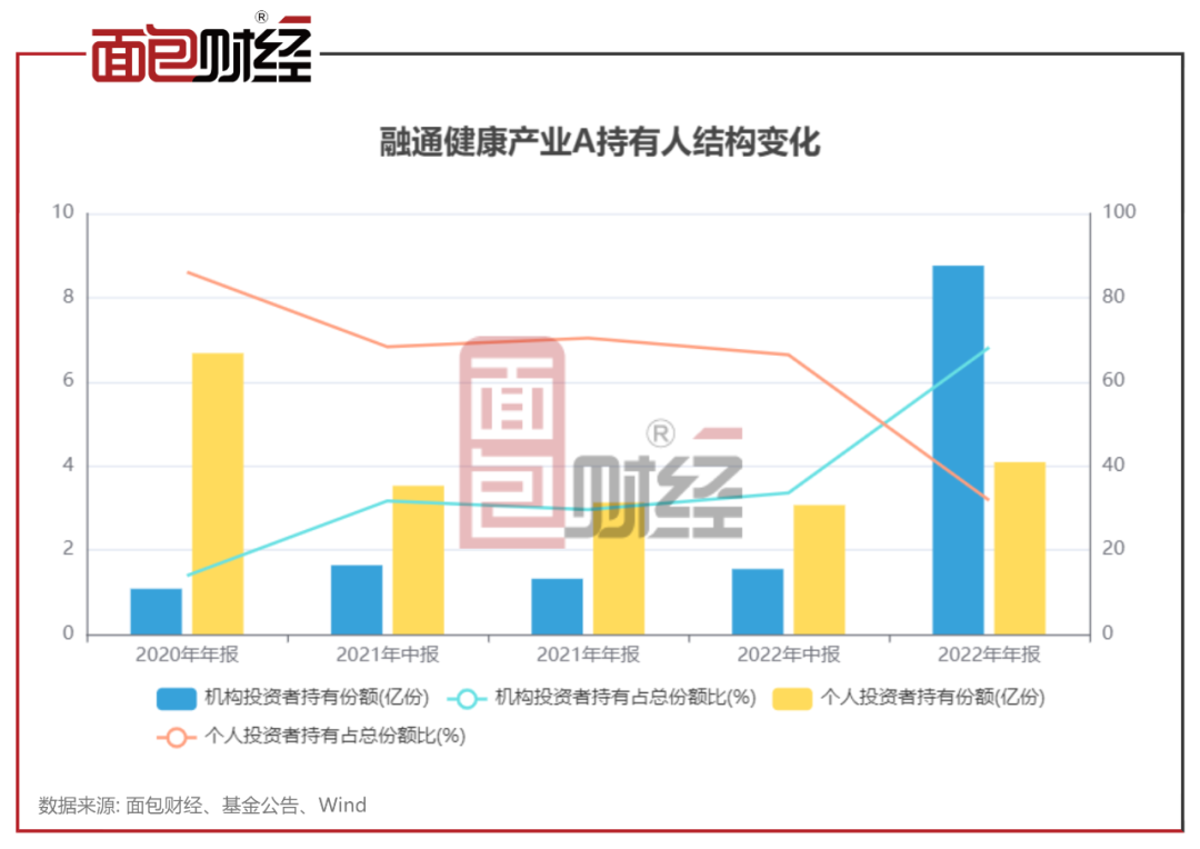 2022年末,万民远管理的融通健康产业A受到机构投资者青睐,成为被FOF基金持有最多、持有规模最大的主动权益基金之一。从中报和年报来看,融通健康产业A2022下半年机构投资者持有比例快速上升至50%以上。