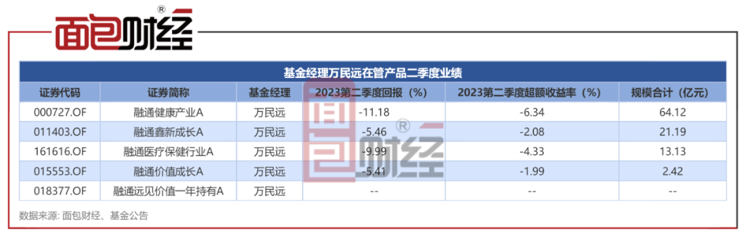 值得注意的是,万民远其他在管产品融通鑫新成长A、融通医疗保健行业A、融通价值成长A,2023年二季度净值收益率均为负,且都跑输同期业绩基准收益率。