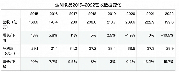 股价表现不佳,除了估值困局,背后也有达利食品近些年业绩下滑的内在因素。