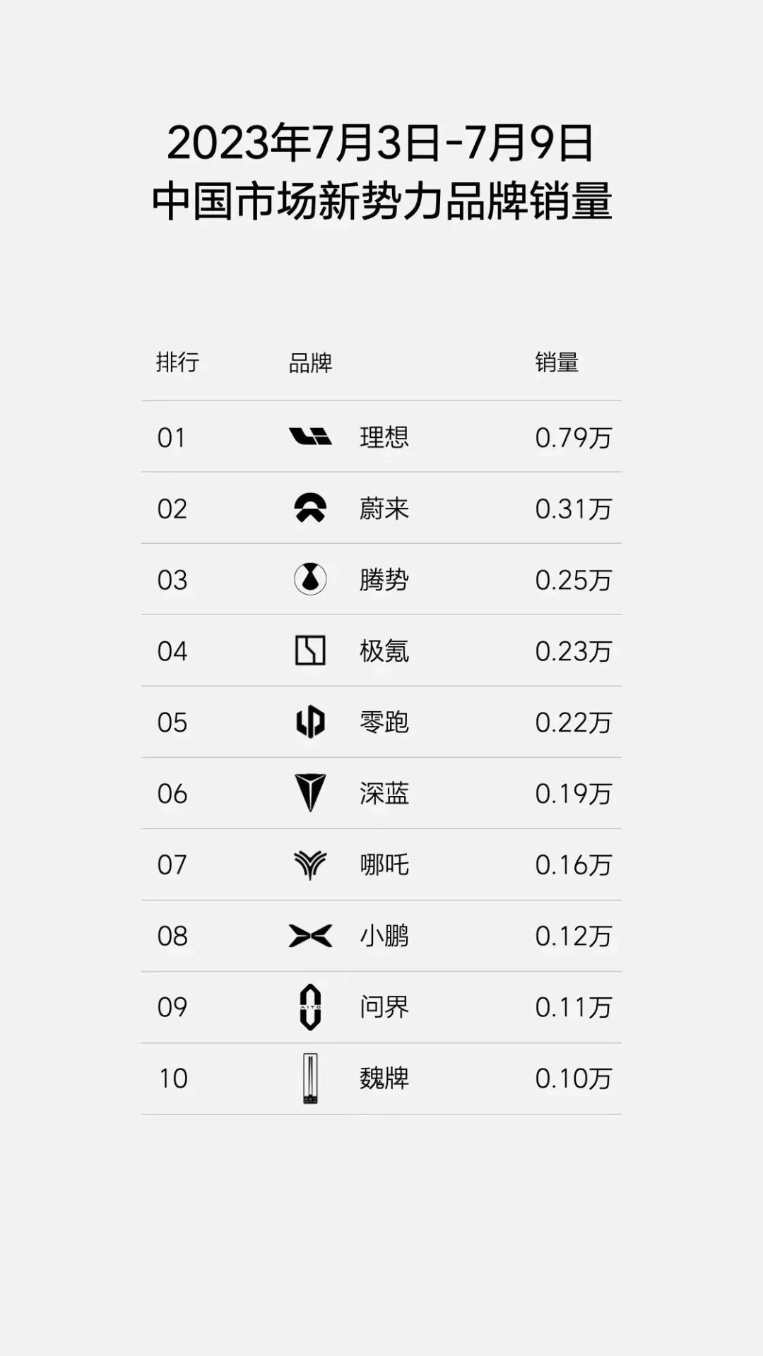 7月11日,理想官方公众号公布7月3日至7月9日新势力周销量排行榜,当中理想凭0.79万销量居第一位,蔚来则以0.31万居第二,小鹏当周销量仅有0.12万,在榜单中排第八。