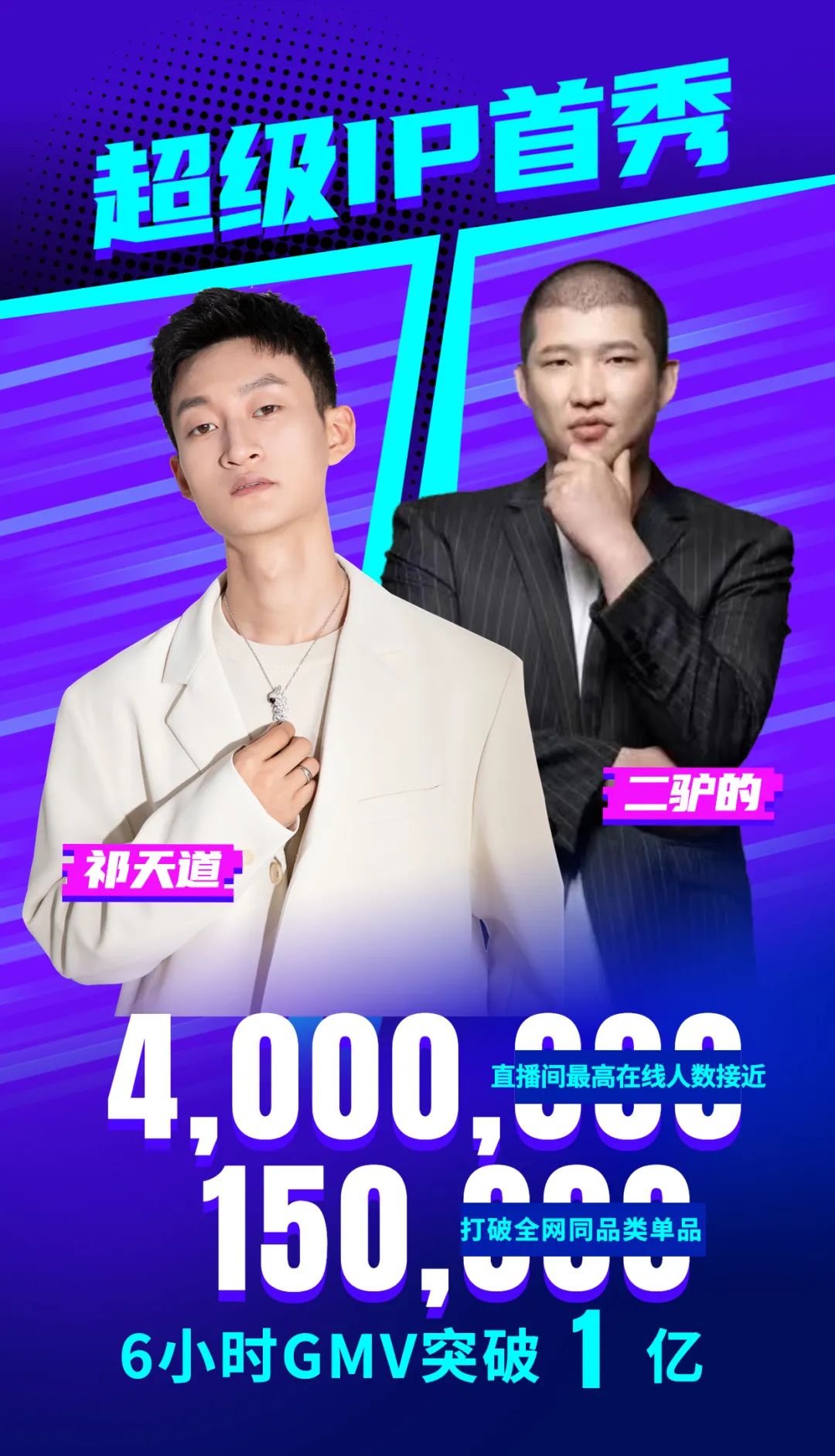 情理之中的,「二驴」与「祁天道」首场带货直播爆单,直播间最高在线人数接近400万人次,6小时GMV成功破亿。其中,仅电信卡这一单品就卖出15万单,打破全网同品类的直播单场销售记录。