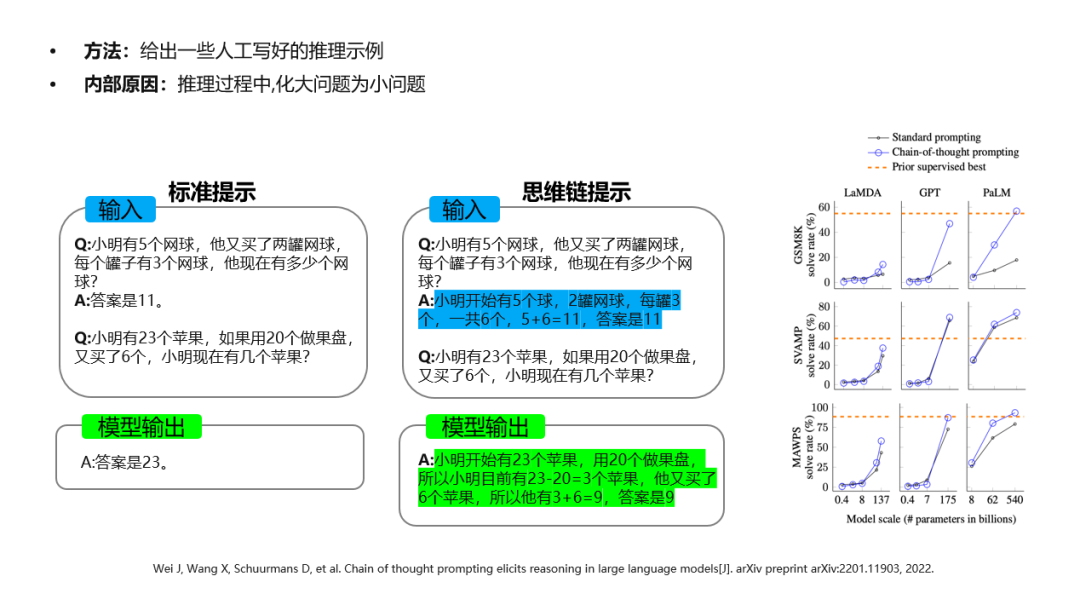 比如“小明原本有5个网球,之后他又买了两罐,每罐有3个网球,他现在有几个网球?”如果这时只是告诉AI大模型答案是11个,那么当用户继续提问“小明有23个苹果,如果用20个做果盘,又买了6个,小明现在有几个苹果?”时,AI大模型很可能无法进行正确推理而答错。