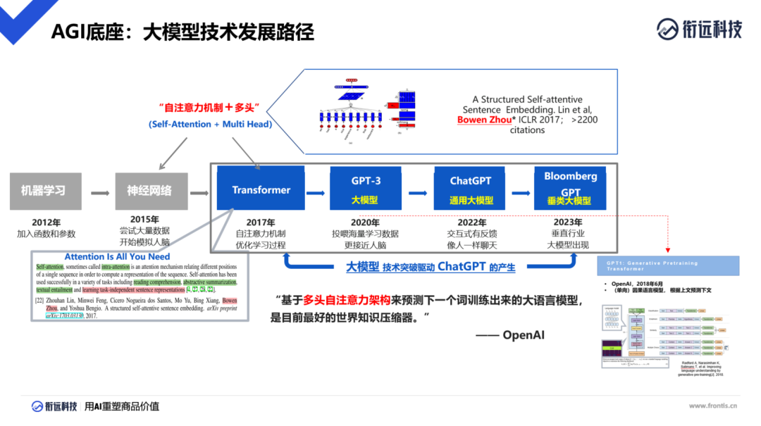 据周伯文介绍,目前我们熟知的ChatGPT的大模型来自于GPT,而GPT是Transformer发展的一个分支。在整个人工智能的发展中,Transformer是引发这一轮AI浪潮的重要里程碑。