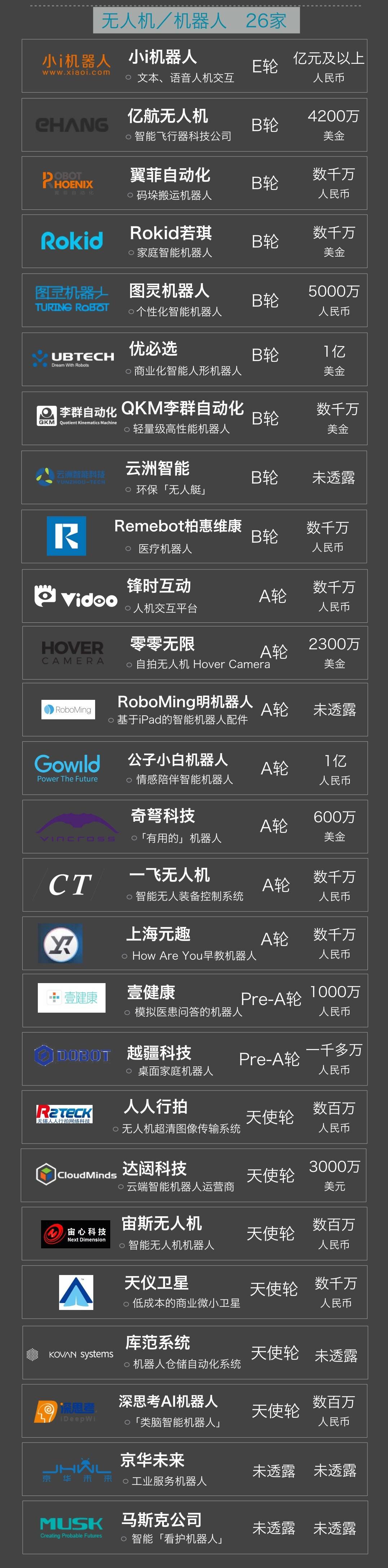 机器人和无人机,作为与日常生活应用联系非常紧密的两个智能硬件领域,在人工智能市场上非常活跃。智能飞行器用于搜寻、拍摄、定位,机器人用于医疗看护、仓储运输、自主作业、聊天问答……这一目录的项目显示着最为强烈的应用性特征。