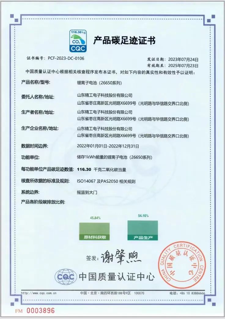 7月24日,山东精工电子科技股份有限公司的锂离子电池(26650系列)获得中国质量认证中心颁发的产品碳足迹证书,这是山东省锂电池产品首张产品碳足迹证书。