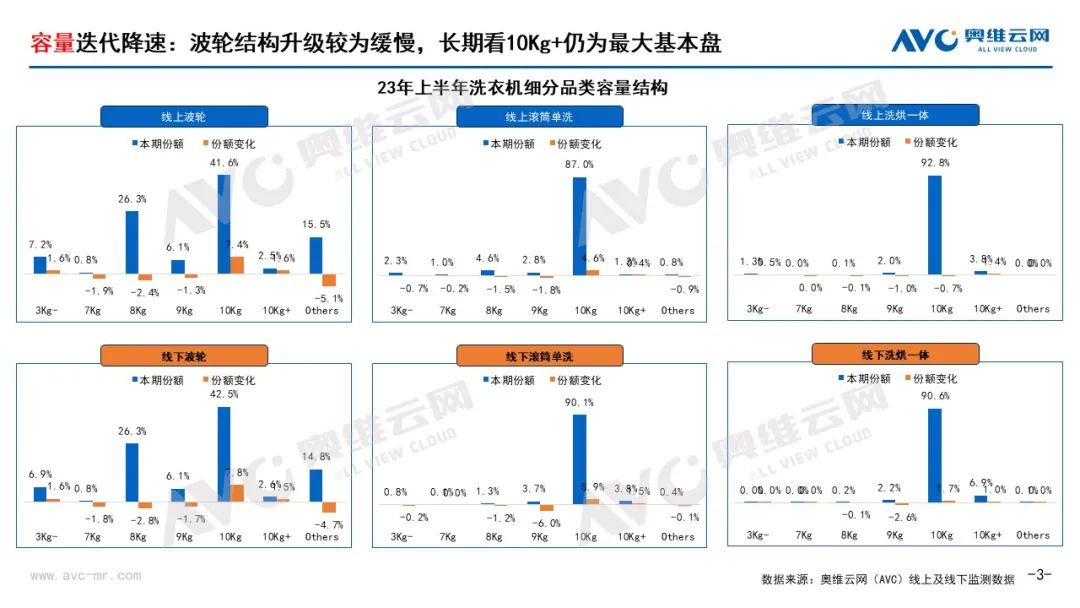 从容量结构上看,迷你洗和超大容量市场空间尚未完全打开,家用场景下的洗衣机仍然以8Kg和10Kg为主。其中波轮市场仍有部分8Kg产品,滚筒市场则是10Kg长期占据主流。短期看,迷你洗市场会伴随供给端的投入而有所增长,长期看,10Kg被取代的市场条件不成熟,10Kg仍是行业最大基本盘。