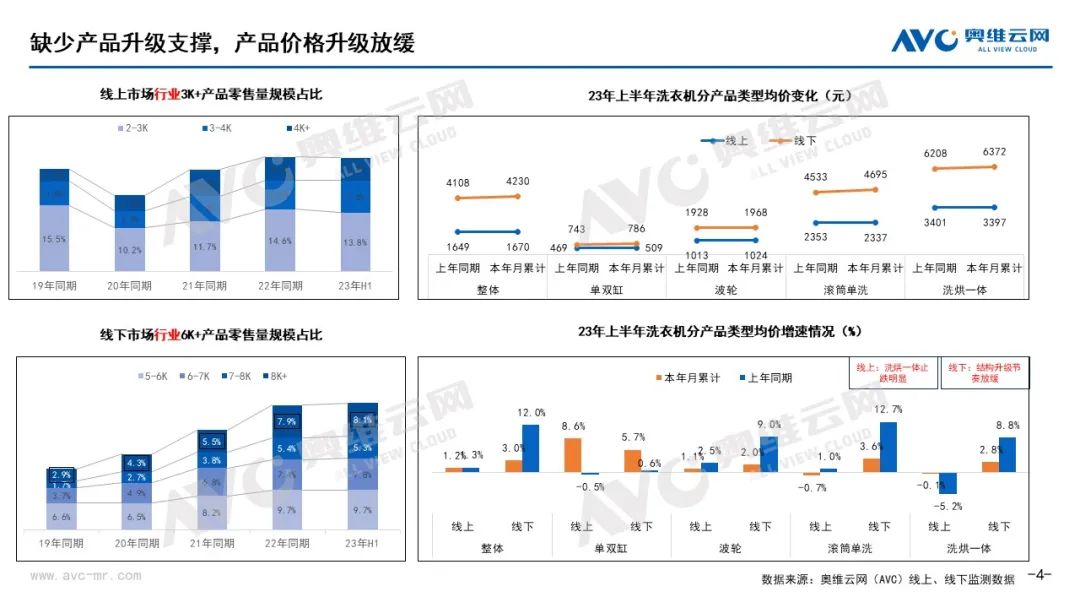在产品升级放缓的客观情况下,洗衣机市场中高端缺乏产品支撑,整体上高端虽有升级但增速有所放缓。但另一方面,市场的价格竞争正在愈发理性,从细分品类价格表现来看,去年价格竞争较为激烈的洗烘一体机基本结束价格下探,市场有望从“价格战”向“价值战”转变。