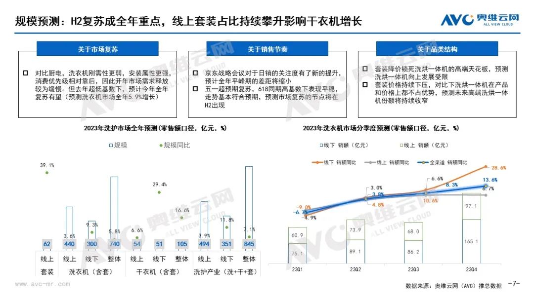 从规模来看,对比其他品类洗衣机刚需性更弱,安装属性更强,消费优先级相对靠后,因此开年市场需求释放较为缓慢。同时,H1为制冷产业旺季,H2为洗护旺季,因而流通端资源也会在H2 向洗护产业倾斜,加之去年旺季下的超低基数,多重因素影响下,预计洗护产业在H2有较大反弹。奥维云网(AVC)预测,2023年洗衣机(含套装)市场全年规模将达到740亿元,同比增长5.8%,洗护产业(洗衣机+干衣机+洗烘套装)则将突破845亿元,同比增长7.1%。