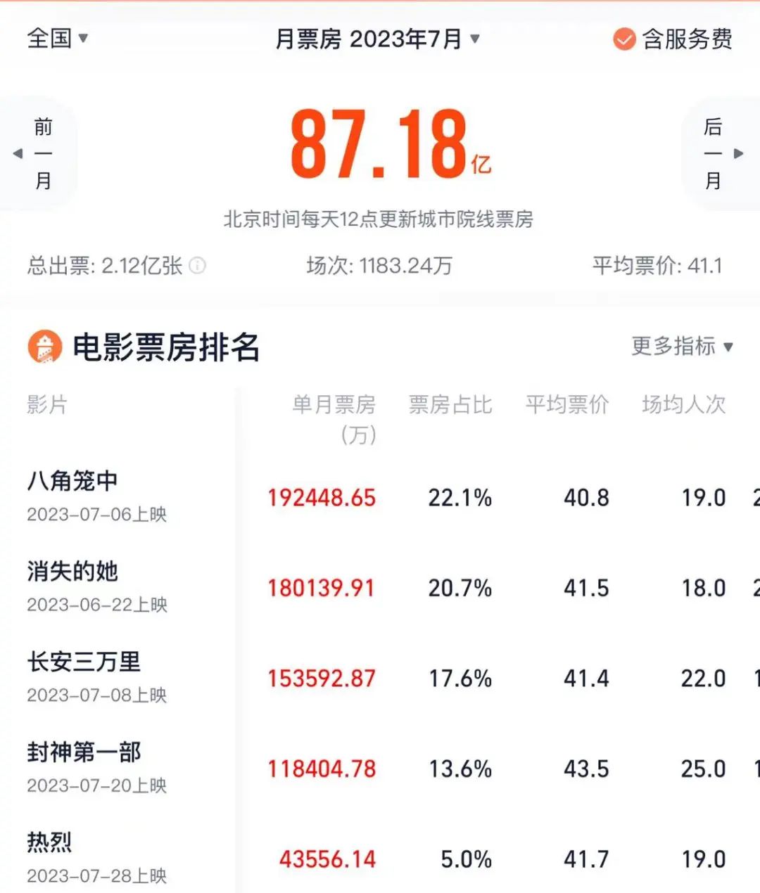 7月总票房87.17亿,为历年7月第一。同比去年上涨148%,环比六月也实现了110%的增长。7月电影并非以量取胜,上映新片数仅37部,而去年同期有54部;重要的是电影拉动了更多人进入电影院,其累计观影人次为2.12亿,去年仅8918万,上座率达14.6%,去年同期为7.2%。