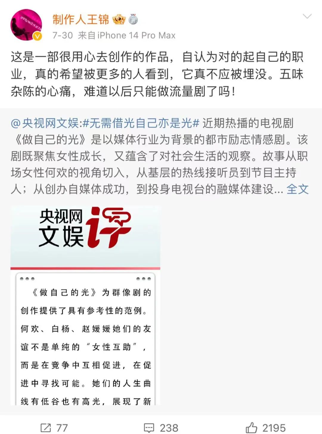 《做自己的光》制片人王锦在7月30日这天转发了“央视网文娱”的微博后说:“这是一部很用心去创作的作品,自认为对的起自己的职业,真的希望被更多的人看到,它真不应被埋没。五味杂陈的心痛,难道以后只能做流量剧了吗!”