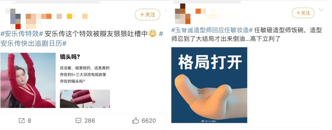 回看7月发布的剧,火的可能都不是剧方想让剧集发酵的点。《玉骨遥》讨论最多的是任敏在戏外出视频证明自己比戏内好看的事,《安乐传》作为龚俊、迪丽热巴主演的剧集,却在开播时迎来了大量对特效的吐槽。而这两部剧,前者全网热搜2876条,后者热搜1660条,都没有比过《我的人间烟火》。