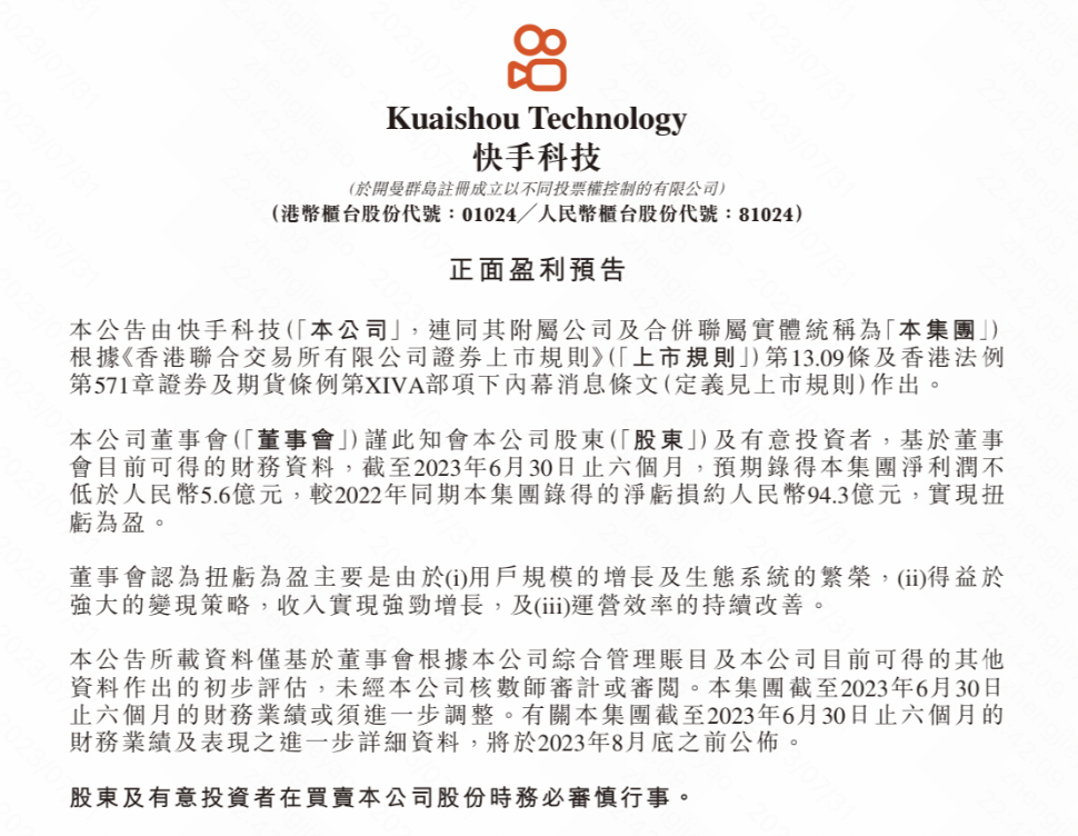 7月的最后一天,快手在港交所发布公告,截至今年年6月30日,预期录得其上半年净利润不低于人民币5.6亿元,较2022年同期约94.3亿元的净亏损,实现扭亏为盈。