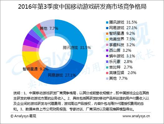 2016年第3季度,常居头部的中国移动游戏研发企业中,除了网易游戏外其余的4个厂商市场额度均有所下降,腾讯游戏下降2.9个百分点达到31.5%,网易游戏增长4.6个百分点达到27.1%,智明星通、完美世界和掌趣科技市场份额分别为9.2%、7.5%和3.2%。除此之外,西山居、蜗牛游戏和乐元素份额均有所增长分别达到2.7%、2.6%和2.4%。
