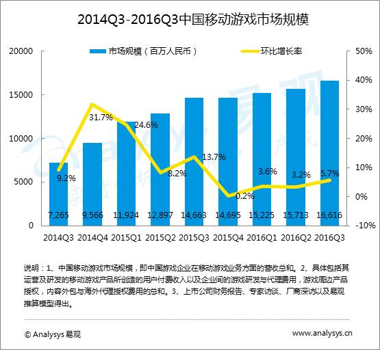 根据Analysys易观发布的《中国移动游戏市场季度监测分析2016年第3季度》数据显示,中国移动游戏市场在2016年第3季度发展增速出现小幅回升,市场规模达到166.16亿元人民币,环比增长5.7%,同比增长13.32%。