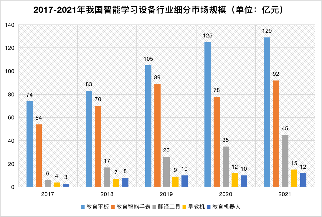 此背景下,读书郎、优学天下、步步高等在2011年后紧跟移动互联网步伐,推出了学生平板、家教机,并成为教育硬件的主力产品。2021年我国教育平板市场规模约为129亿元,占智能学习设备行业规模的44.03%。