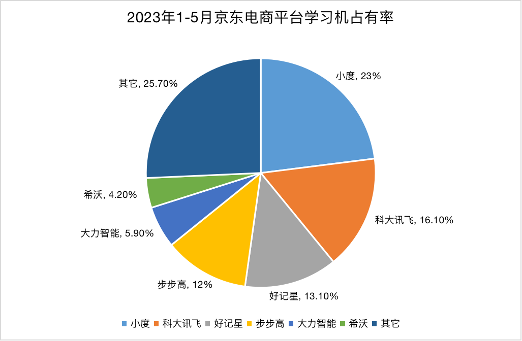 今年1-5月,京东电商平台学习机占有率的排名依次是小度、科大讯飞、好记星和步步高。