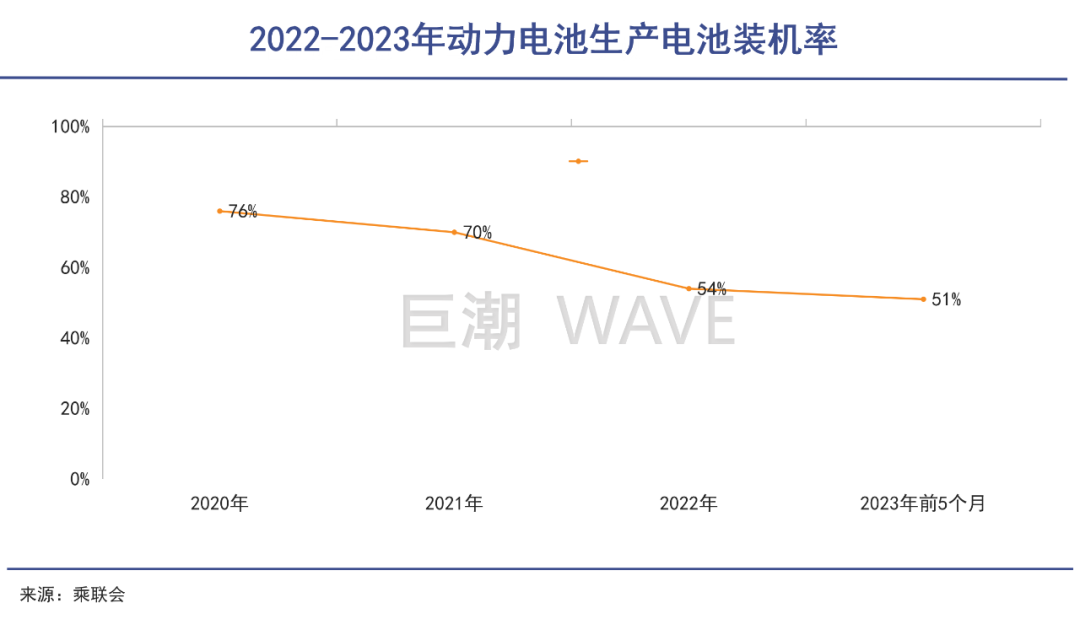 据中国汽车动力电池产业创新联盟的数据,2022年,我国动力电池累计产量545.9GWh,但累计装车量为294.6GWh,占比仅为54%。到了2023年,这个数字仍在进一步降低。