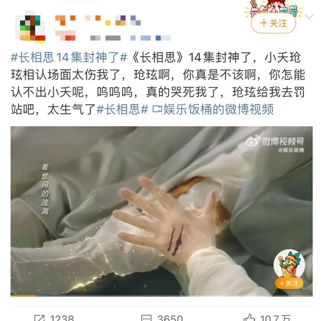 剧情里,表哥玱玹不识分别三百年的妹妹小夭,打断了她的腿,后来得知真相,含泪运功为小夭疗伤治腿。这经典一幕自带“骨科”双关,引得不少剧粉大呼精彩,“夭玹”CP也就此上分。当晚“长相思14集封神了”的话题直奔热搜榜第一。