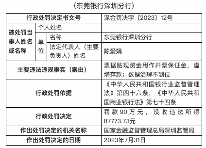8月4日,国家金融监督管理总局公布的行政处罚信息公开表显示,2023年7月31日,东莞银行深圳分行被处罚款90万元,没收违法所得87773.73元。主要违法违规事实为:票据贴现资金用作开票保证金,虚增存款;数据治理不到位。
