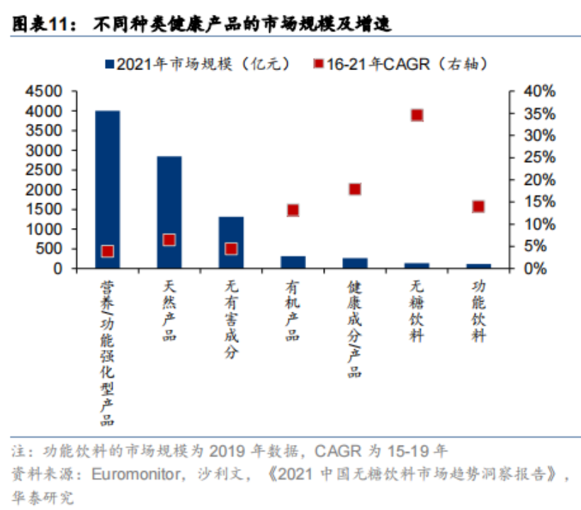 其中,营养功能性茶品和天然产品市场会比较成熟。从2016年至2021年,市场规模的年复合增长率是4%、6%和4%。