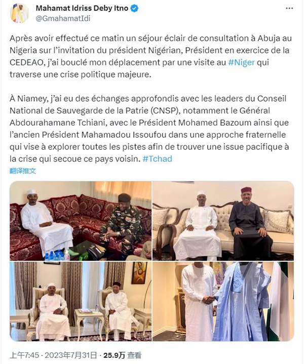 乍得总统代比(Mahamat Idriss Déby)上周日在尼日尔与巴祖姆会面,还在推特上放出了两人会面的照片。