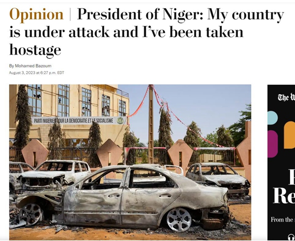 周四,《华盛顿邮报》发表了巴祖姆的文章。巴祖姆列出了尼日尔近年来在经济和安全上取得的进步,把尼日尔称为萨赫勒地区“尊重人权的最后一个堡垒”,呼吁美国政府和国际社会伸出援手。他对美国人拉响警钟:如果尼日尔政变者上位,整个萨赫勒中部地区都会成为俄罗斯的地盘。