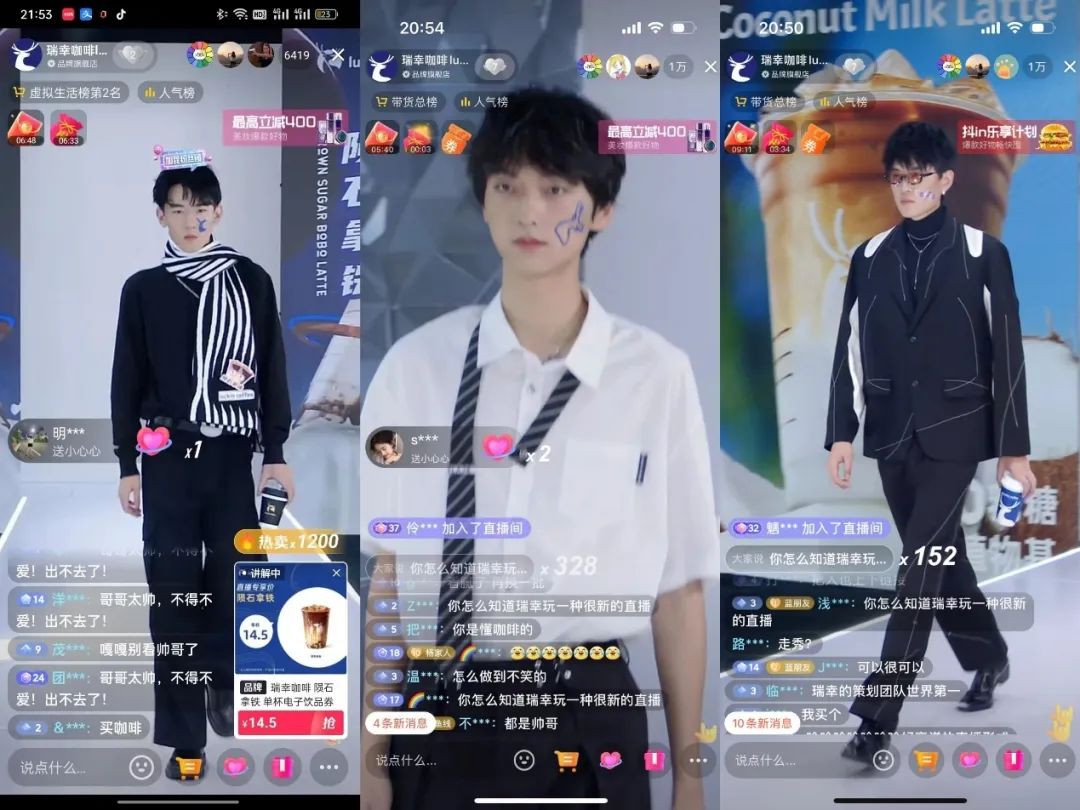 先是去年双十一,瑞幸咖啡整了个大活儿,联合浙江理工大学的男学生们,在直播间来了场T台走秀。盘靓条顺的鲜肉帅哥们相继亮相,人手一杯瑞幸咖啡,脸上还印着瑞幸logo,每一步都走在观看者的心巴上。