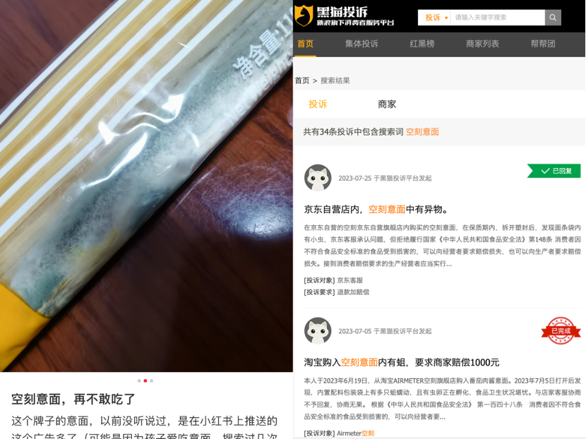 但在众多社交平台上,不乏有空刻意面产品存在异物的投诉。