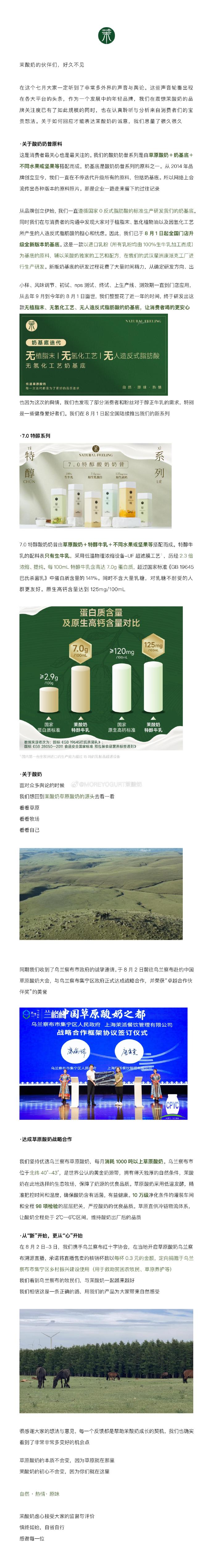 8月5日,茉酸奶就酸奶奶昔原料争议发文称,8月1日起,茉酸奶全国门店的所有酸奶奶昔产品将升级使用全新版本奶基底。这款奶基底无植脂末、无氢化工艺、无人造反式脂肪酸。