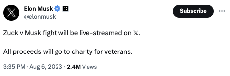 8月6日,马斯克在旗下社交平台X上宣布,其与Meta首席执行官马克·扎克伯格之间约定的格斗将在X平台直播。马斯克写道:“扎克与马斯克之战将在X上直播。所有收益将捐给退伍军人慈善机构。”