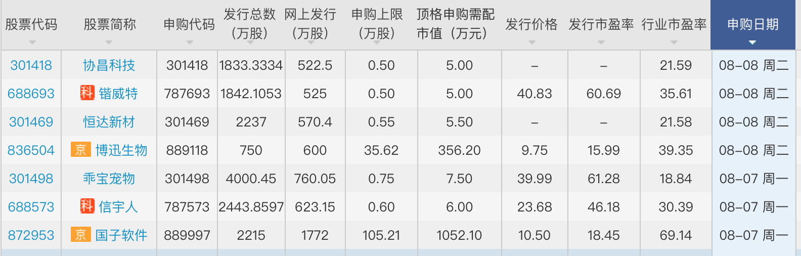 8月8日周二将集中申购4家公司:博迅生物(836504.BJ)、恒达新材(301469.SZ)、锴威特(688693.SH)、协昌科技(301418.SZ)。