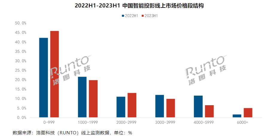而市场数据也证明超高端智能投影在行业中不断受宠。洛图数据显示,今年上半年6000元以上价格段市场占比为5.0%,较去年同期上涨3.4个百分点。这表明智能投影“在高端市场”的空间依然巨大,这也会刺激更多的品牌“进一步冲高”的决心。