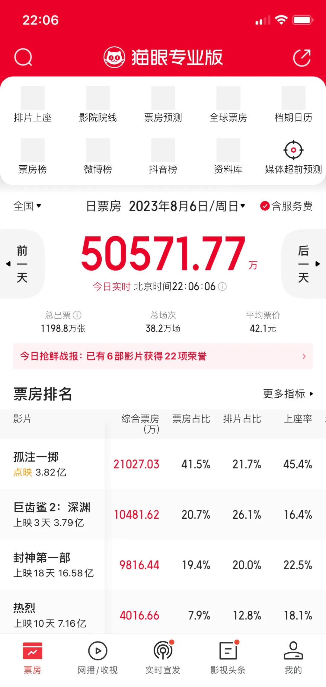8月5日点映的第一天,就以15.4%的排片率拿下了1.71亿的票房,上座率竟然超过50%;而点映的第二天,也就是今天(8月6日)依然延续了强势的数据,截止8月6号晚上10点的又拿到了超过2亿的票房,上座率依然高达45.4%,两天累计拿到近4亿票房。