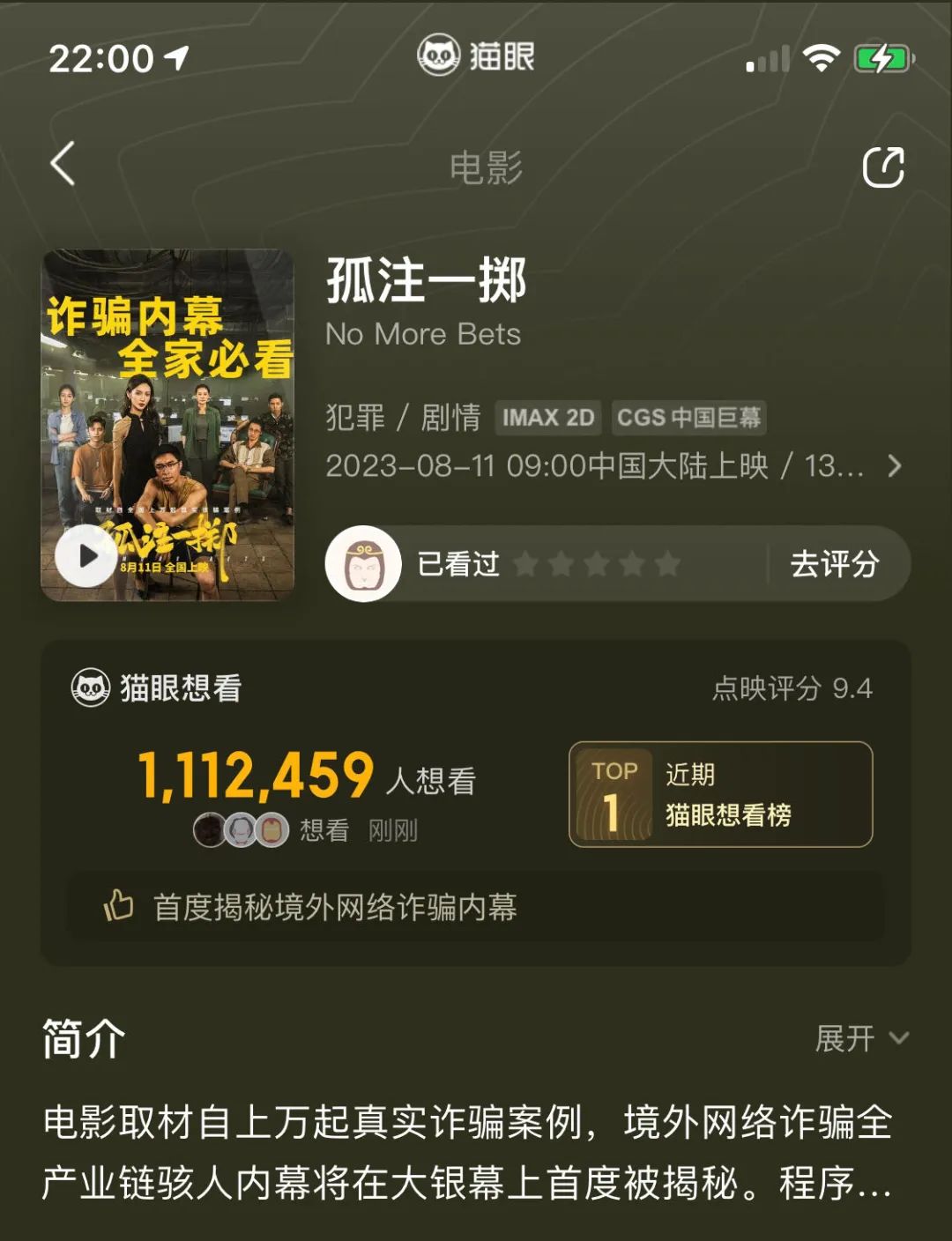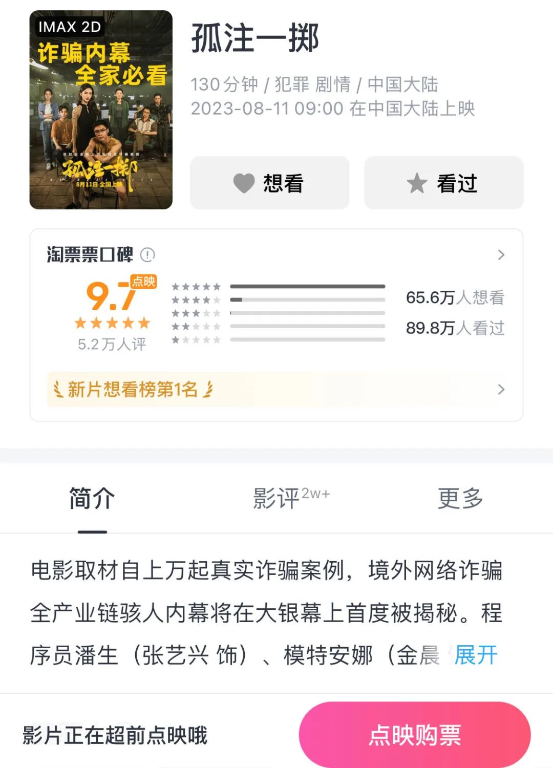 截止8月6日晚上10点,《孤注一掷》在猫眼上的想看人数已经突破100万,达到111.2万人,是今年暑期档想看人数最高的一部电影;在淘票票上的想看人数也达到了65.4万人,登顶新片想看榜榜首位置,从这两条数据就可以瞥见影片当下的热度。