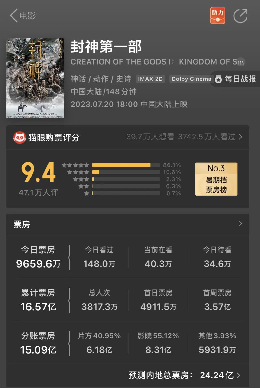 目前猫眼的观众评分是9.4分,处于暑期档头部水平;而淘票票的评分达到了9.7分,比《热烈》的9.5分、《长安三万里》的9.6分、《八角笼中》的9.1分都要高,是今年暑期档评分最高的电影,说明已经看过点映的观众对影片质量是认可的。