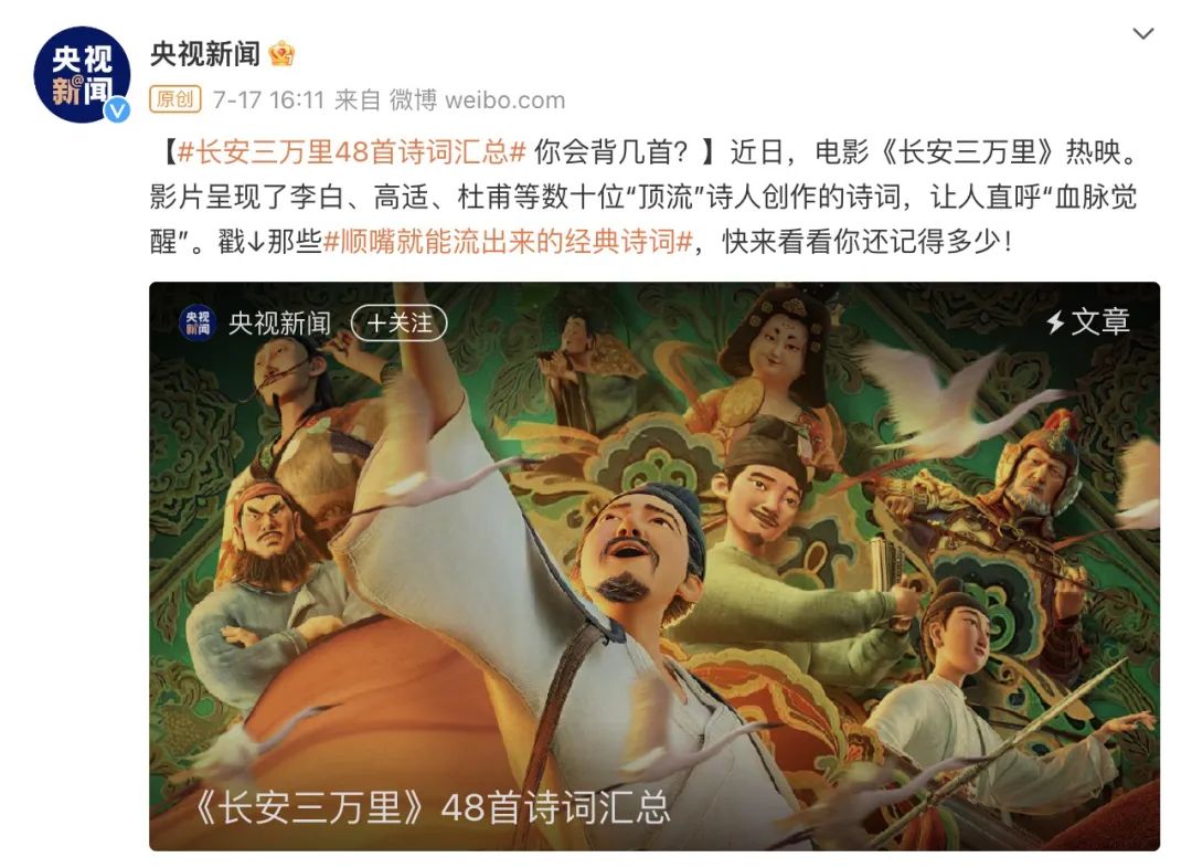 《长安三万里》的宣发,把一个看似与我无关的文化产品,变成了一个与普罗大众息息相关的精神产品,疗愈了很多普通观众。电影既使部分影迷接受诗词洗礼与文化熏陶,又能让广大观众找到情绪的宣泄窗口。