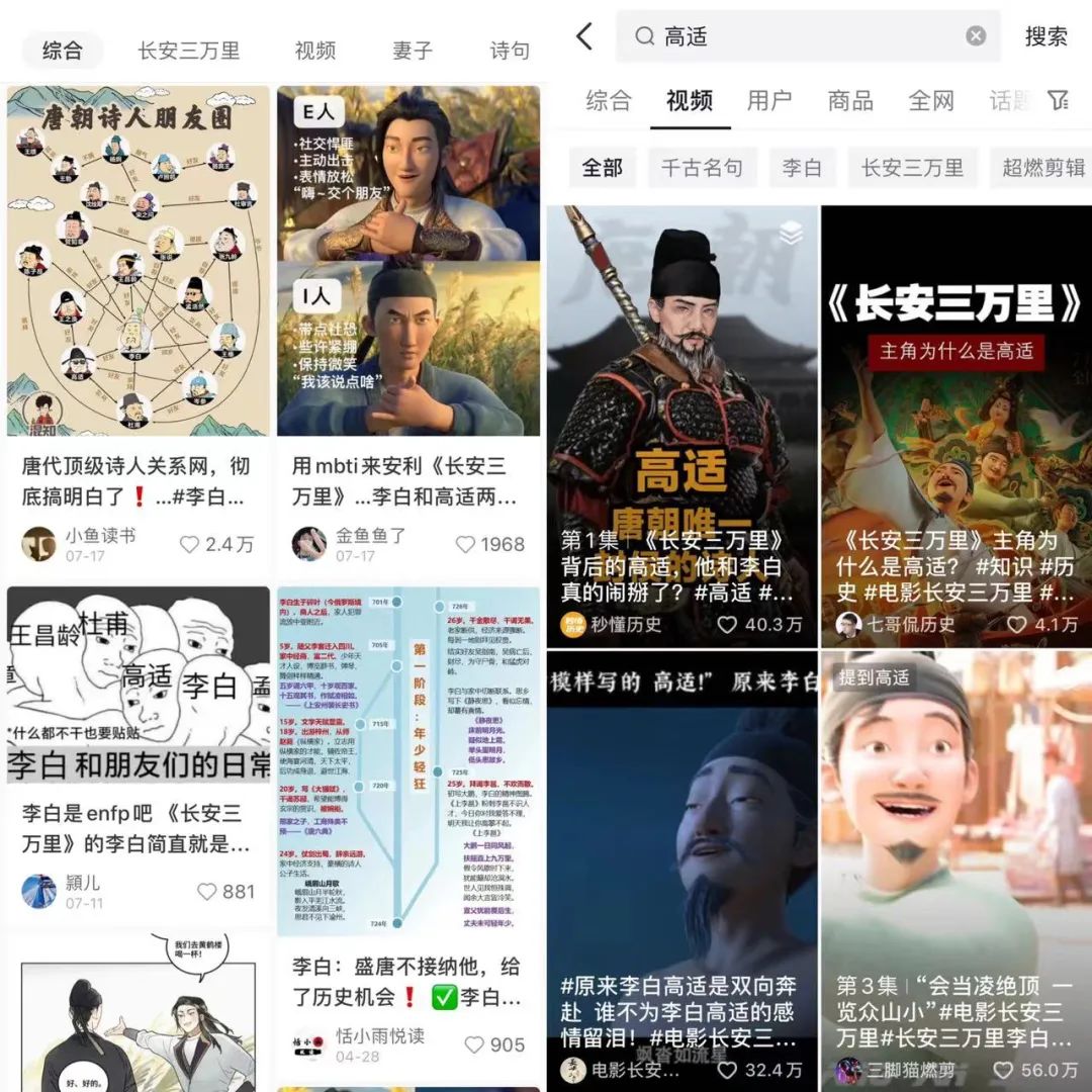 勾起了圈层外观众的好奇心后,电影宣推再接再厉,侧重推广盛唐的群星人物魅力。《长安三万里》看似没有明星,实则“星光熠熠”。故事主角李白、高适、杜甫等作为唐朝顶流,不亚于任何一位现役流量明星。我们可以看到微博、小红书、抖音、快手平台出现大量李白、高适、杜甫等人物解读,引来很多人好奇盛唐诗人的真实朋友圈关系。即使你是古诗词学渣,也不免被这些刷新认知的八卦所吸引。