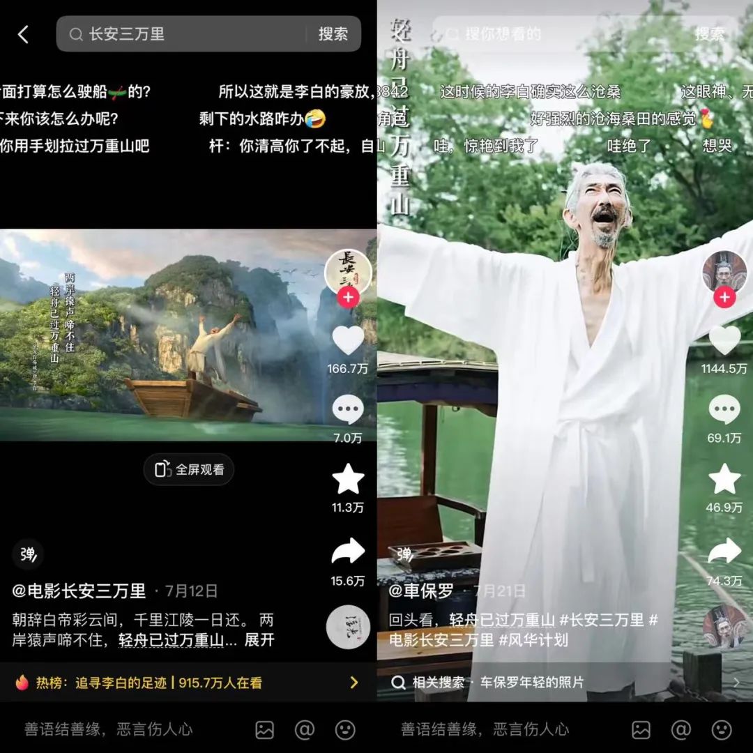 我们可以在各大平台看到点赞破百万的热门视频——电影里呈现李白划船吟诗“轻舟已过万重山”的片段。该片段还被香港老戏骨车保罗cosplay,获得千万点赞,并在短视频上引发了达人翻拍潮。