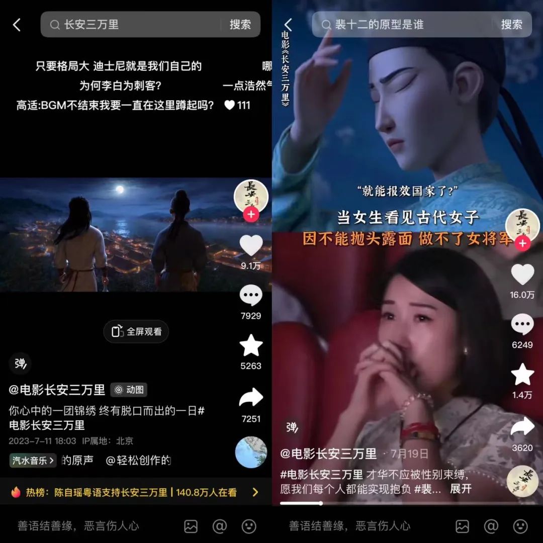 另外有很多女性观众共情了原创的“女剑客”裴十二一角,引发热搜话题#长安三万里裴十二好惊艳#。电影中,裴十二文武双全却因唐朝的性别歧视而无法施展抱负,与当下很多女性观众的处境古今同悲。